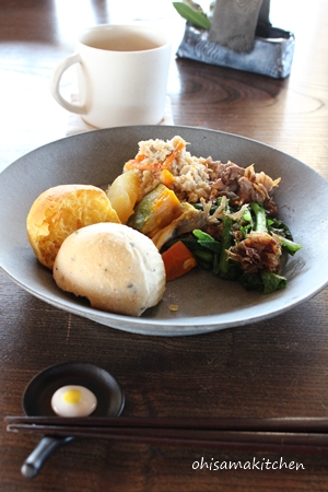 お料理・旬・食卓今日のお昼 作り置きのありあわせごはんだけど 器が美味しくしてくれる♪ パンは今朝焼いたおからパンとにんじんパン(写真はにんじんのパンです) 焼き立てを味見にちぎって食べた残り(笑) おかずは 煮物の残り汁で作ったおからや南瓜の煮物、そしてカブの葉とだしをを取った後のかつお節を炒めたもの これでたんぱく質も摂れる~♪ 午後も頑張れた♪ 投稿者: 後藤 和美 後藤 和美 のすべての投稿を表示