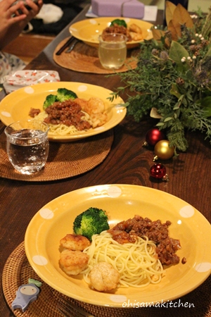 お料理・子ども料理塾・旬・食卓子ども料理塾 明日から冬休みだそうですよ~ 冬休みは短いけど、クリスマスにお正月に楽しい行事がたくさんね♪ スパゲティミートソースとチキンナゲットを作りました。 美味しかったね~ またおうちでも作ってみてね~