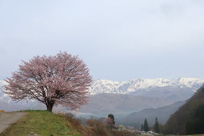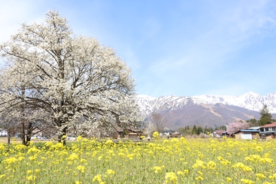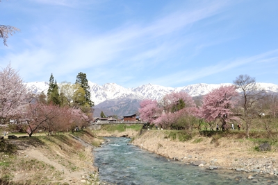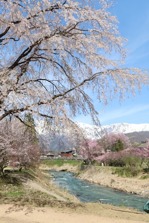 アルプスを背景に、川も流れ、絶景の写真スポットですね。